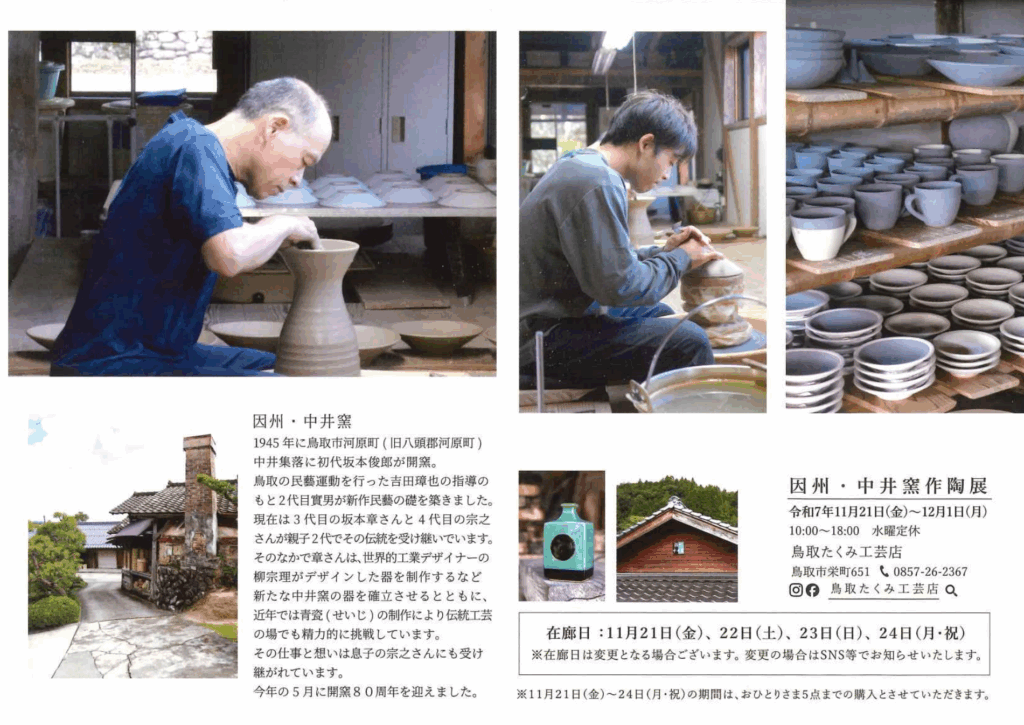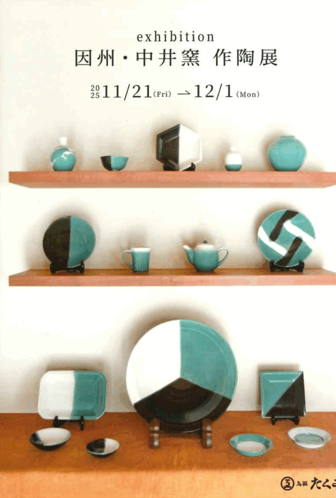 11月21日(金)~12月1日(月)、鳥取市のたくみ工芸店で「因州・中井窯 作陶展」が開催されます。