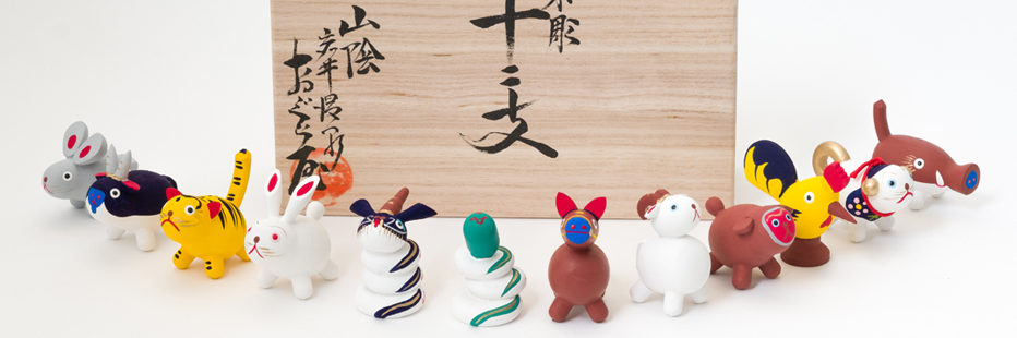 因幡地方最古の岩井温泉の温泉街の一角に「おぐら屋」はあります。約200年前に木地師(きじし)の小椋佐兵衛が挽物(ひきもの)を製作したのが始まりですが、その流れをくむ小椋家八代目により、従来の挽物に独創的なデザインと技術を加えて木彫人形十二支が作られました。全体を挽物細工で作り、泥絵具で彩色しています。