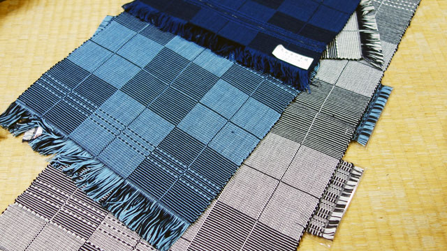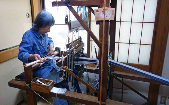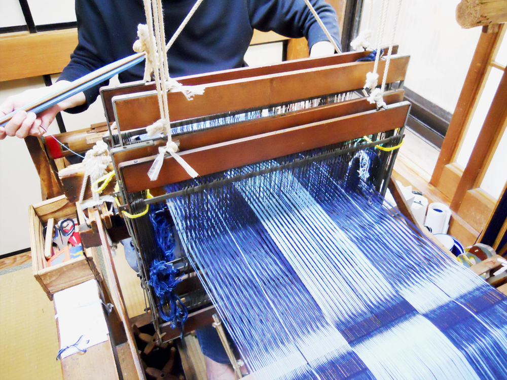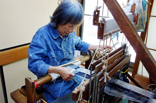 木綿糸を藍で染め一間機(いっけんばた)で織った因幡の手織りです。 四枚の綜絖(そうこう)に糸を計算して通し4本の踏木を踏む足の順番によって織り柄 を作り出します。 江戸時代の農民は衣服の素材や色が制限され木綿を藍染にしたもの以外扱えませんで した。藍染の発達とともにその制限のなかで少しでも美しい表現や技法が工夫されてい きました。鳥取藩主池田候は産業振興策として機織を奨励したので厳しい農作業の合間 を利用し盛んに織られるようになり姑から嫁へと代々伝えられてきました。 社会の移り変わりにより廃絶が心配されていましたが、現在もしっかり継承されてい ます。 因幡地方では四枚の綜絖に糸を通すことを「しまい」に「へる」ということから 「しまいべ織」と言い伝えられていますが、明治中頃には「風通織(ふうつうおり)」 とも呼ばれ大流行したこともありました。| 所在地 | 鳥取県鳥取市浜坂東1-14-22 |
