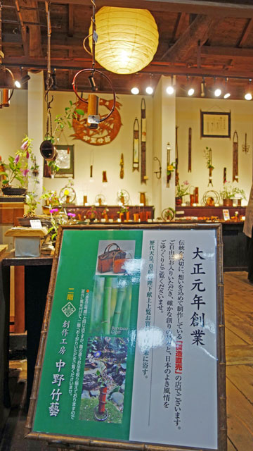 中野竹藝は、大正元年(1912年)創業の老舗で、洗練されたモダンな作品から昔の伝統を受け継いだ風情あるものまで、数多くの作品をご用意しております。 また、丸竹加工と言われる、竹を割らないで丸のまま曲げたり真っ直ぐにして制作する特殊技法竹を用いた作品や丹念に編み込まれた美しい篭も魅力です。| 所在地 | 鳥取県倉吉市東仲町2573 |